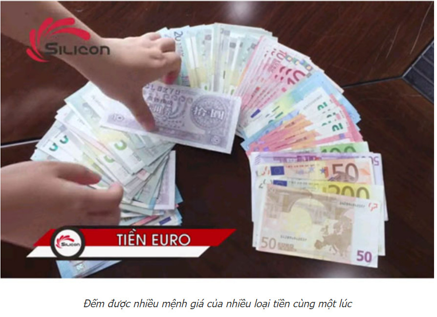 - Có khả năng nhận, đếm, cộng tổng, phát hiện giả tự động khi đưa 1 trong những loại tiền VND,USD, EURO, RMB vào đếm.