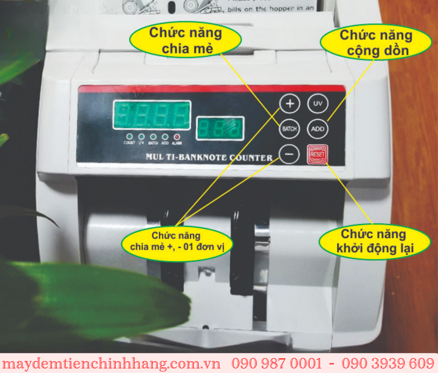 Chức năng: Đếm số lượng tiền giấy, Polyme, vé số, ngoại tệ, chia mẻ, cộng dồn...